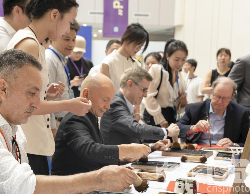 9月2日,浙江温州,外国学者体验写毛笔字、活字印刷。当日,参加中国人民大学主办的“中国式现代化与世界未来”明德战略对话(2024)系列活动的部分嘉宾来到温州商学院进行交流。 中新社记者 吴君毅 摄