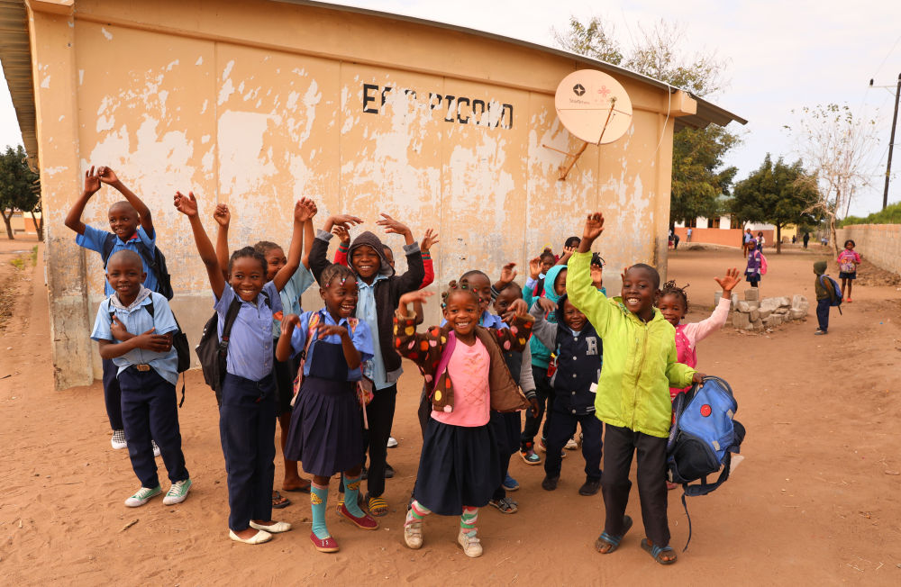 2023年7月25日,莫桑比克马普托省皮科科村学校的孩子们站在装有中国援助的卫星电视接收天线的房屋前。“万村通”项目旨在为非洲国家的1万个村庄接入卫星数字电视信号,项目2018年在莫桑比克启动,为该国1000个村落、2万户家庭和3000个公共场所安装卫星电视设备,提供电视信号和节目,覆盖农村人口达250万。新华社记者 董江辉 摄
